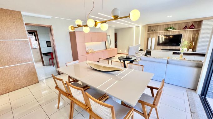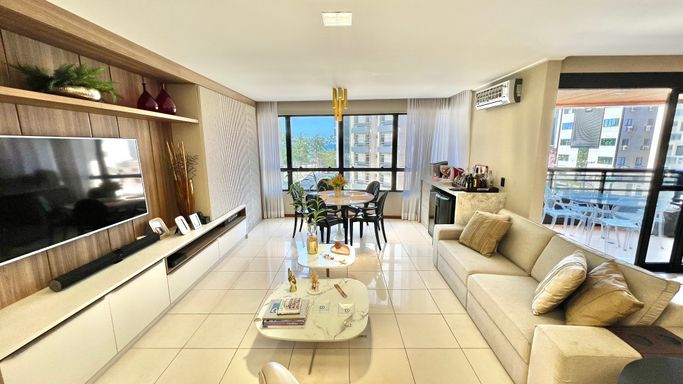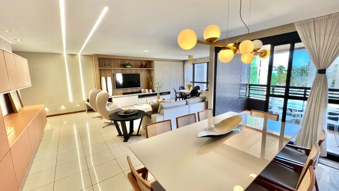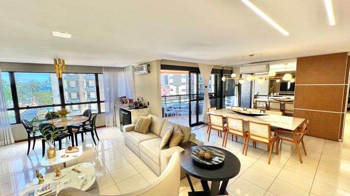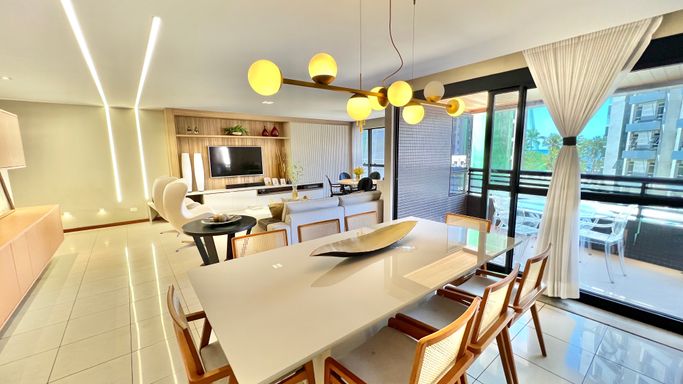 O imóvel conta com 4 quartos, sendo 3 suítes, com destaque para a suíte master, que possui varanda com vista para o mar. A área social é ampla, com sala para 3 ambientes, ideal para quem valoriza conforto e integração dos espaços.