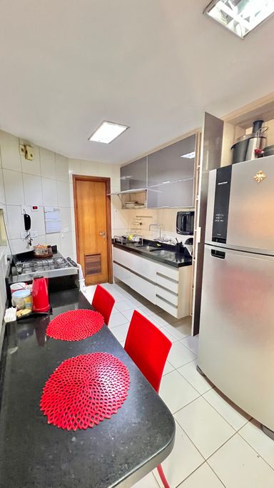 A cozinha é funcional, com área de serviço independente e dependência completa (DCE). O apartamento dispõe ainda de 3 vagas de garagem soltas, garantindo praticidade e comodidade.